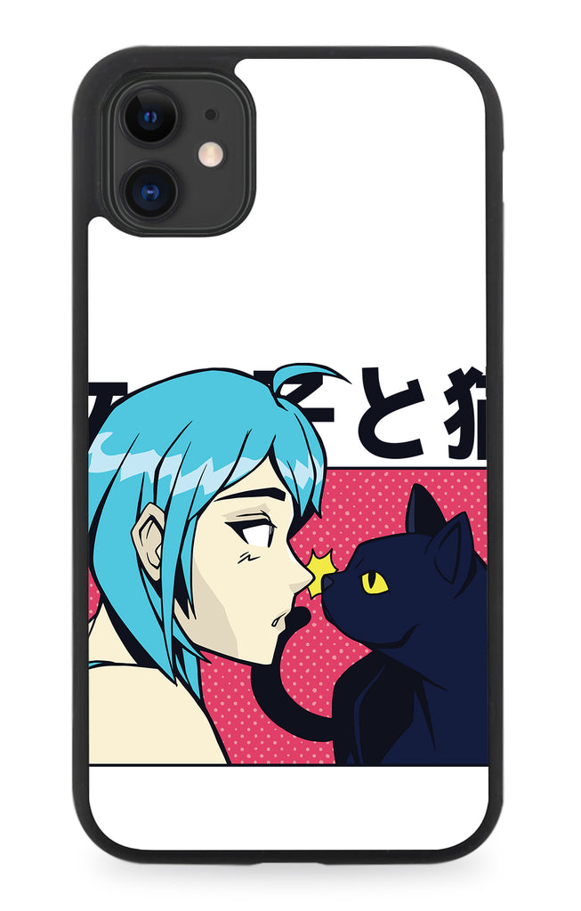 Anime Girl and Black Cat Cartoon Rubber Phone Case Cats Girls Blue Hair M053