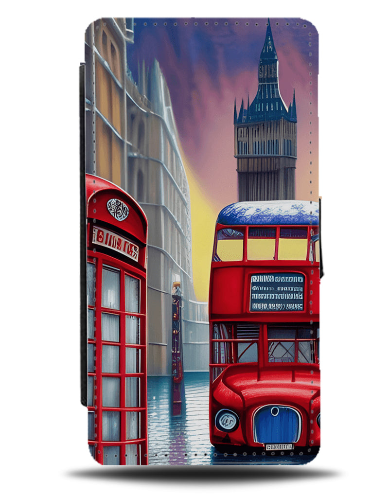 London Painting Print Flip Wallet Phone Case Red Double Decker Bus Telephone Box BP61