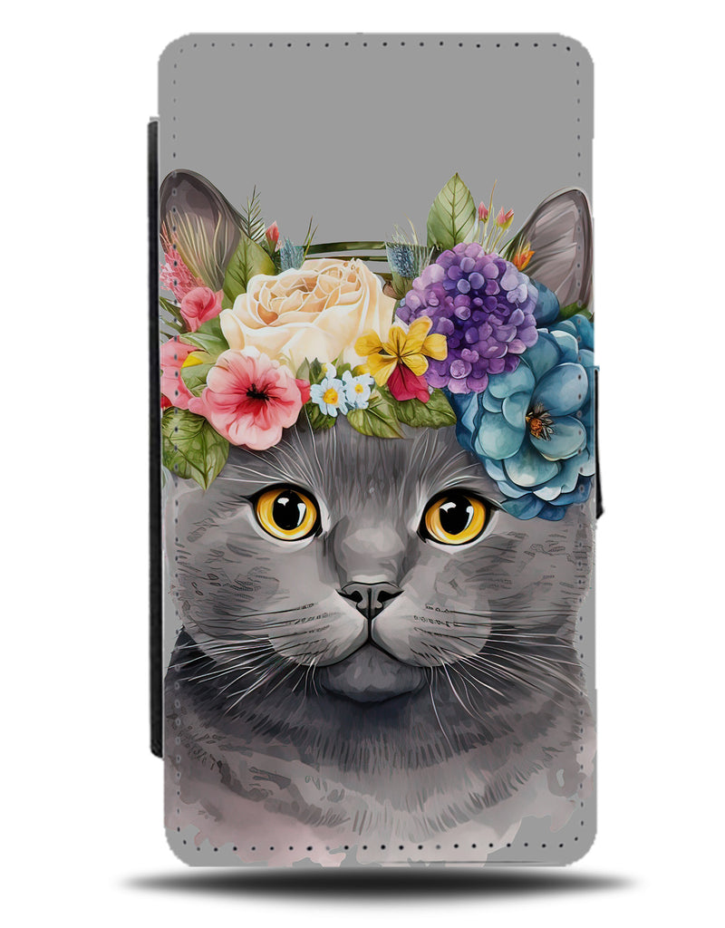 Grey British Shorthair Flip Wallet Case Cat Cats Short Hair Flower Crown DL60 - Flip Wallet Cases