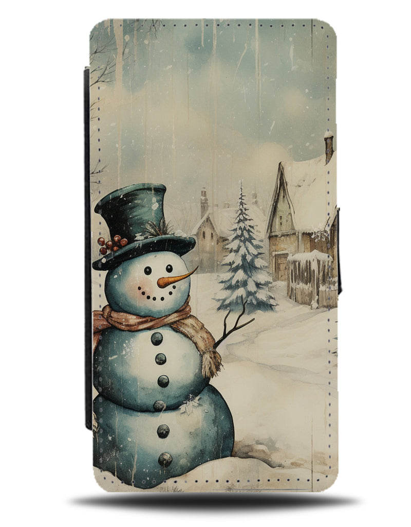 Vintage Christmas Card Design Flip Wallet Case Xmas Snowman Village English DQ04