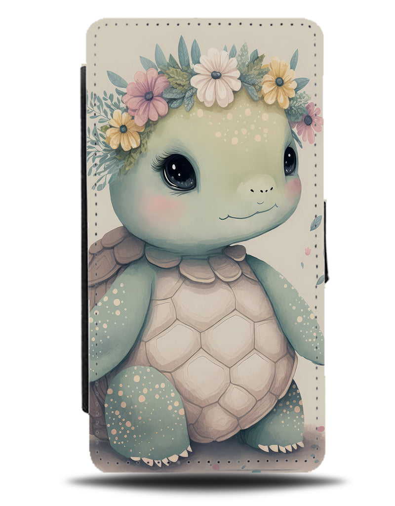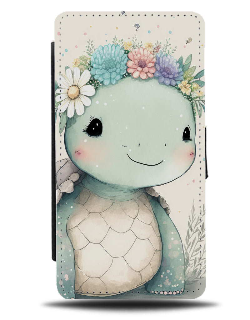 Turtle In Flower Crown Flip Wallet Phone Case Turtles Watercolour Painting Green BR09