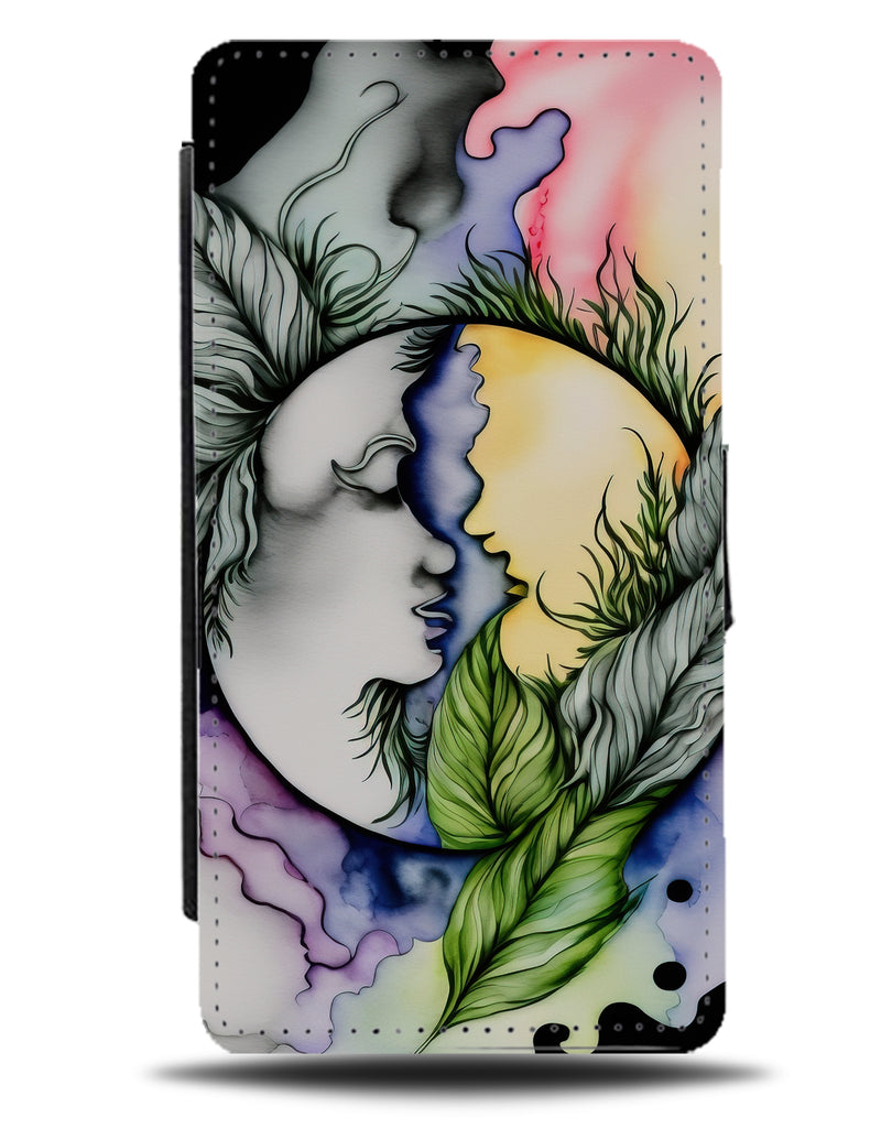 Sun and Moon Flip Wallet Phone Case Leaves Faces Celestial Style Spiritual Look BQ54