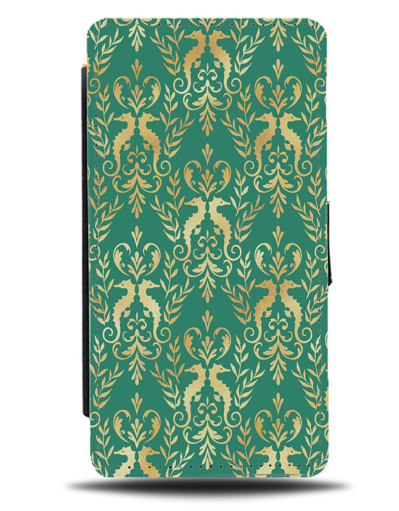 Green and Gold Seahorse Pattern Flip Wallet Phone Case Sea Horse Seahorses Golden BK23
