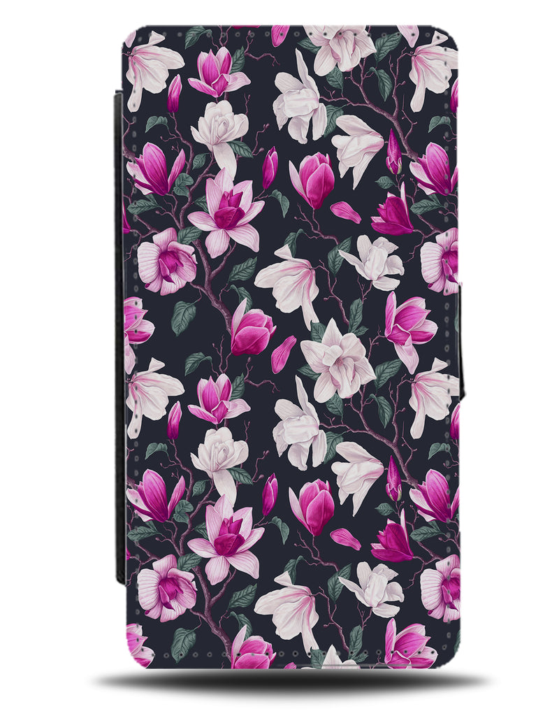Dark Purple Floral Magnolias Pattern Flip Wallet Phone Case White Pink Magnolia BK70