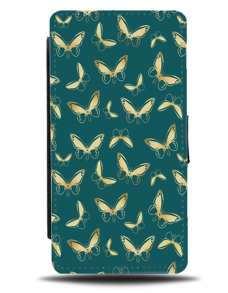 Dark Green With Golden Butterfly Wings Flip Wallet Phone Case Butterflies Gold Q702C