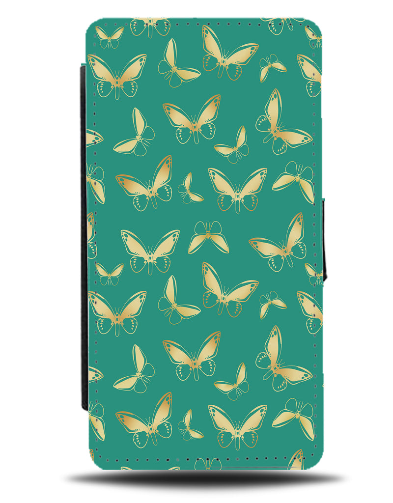Dark Mint Green Flip Wallet Phone Case With Golden Butterflys Flying Shapes Q702F