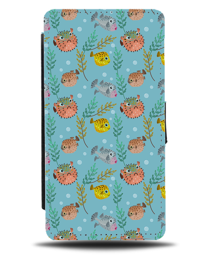 Cartoon Puffer Fish Flip Wallet Phone Case Puffers Pattern Blue Sea Puffing Blow BJ37
