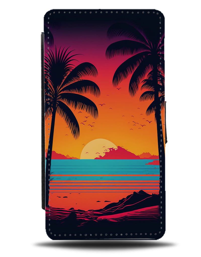 Cartoon Sunset On The Beach Over The Ocean Flip Wallet Phone Case Sea Palm Trees BU57