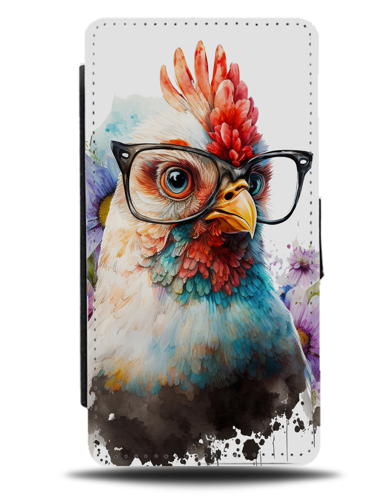 Chicken In Glasses Watercolour Picture Flip Wallet Phone Case Chickens Head Face Q581A