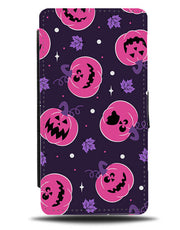 Hot Pink Pumpkins Flip Wallet Case Neon Halloween Design Purple Leaves N645 - Flip Wallet Cases